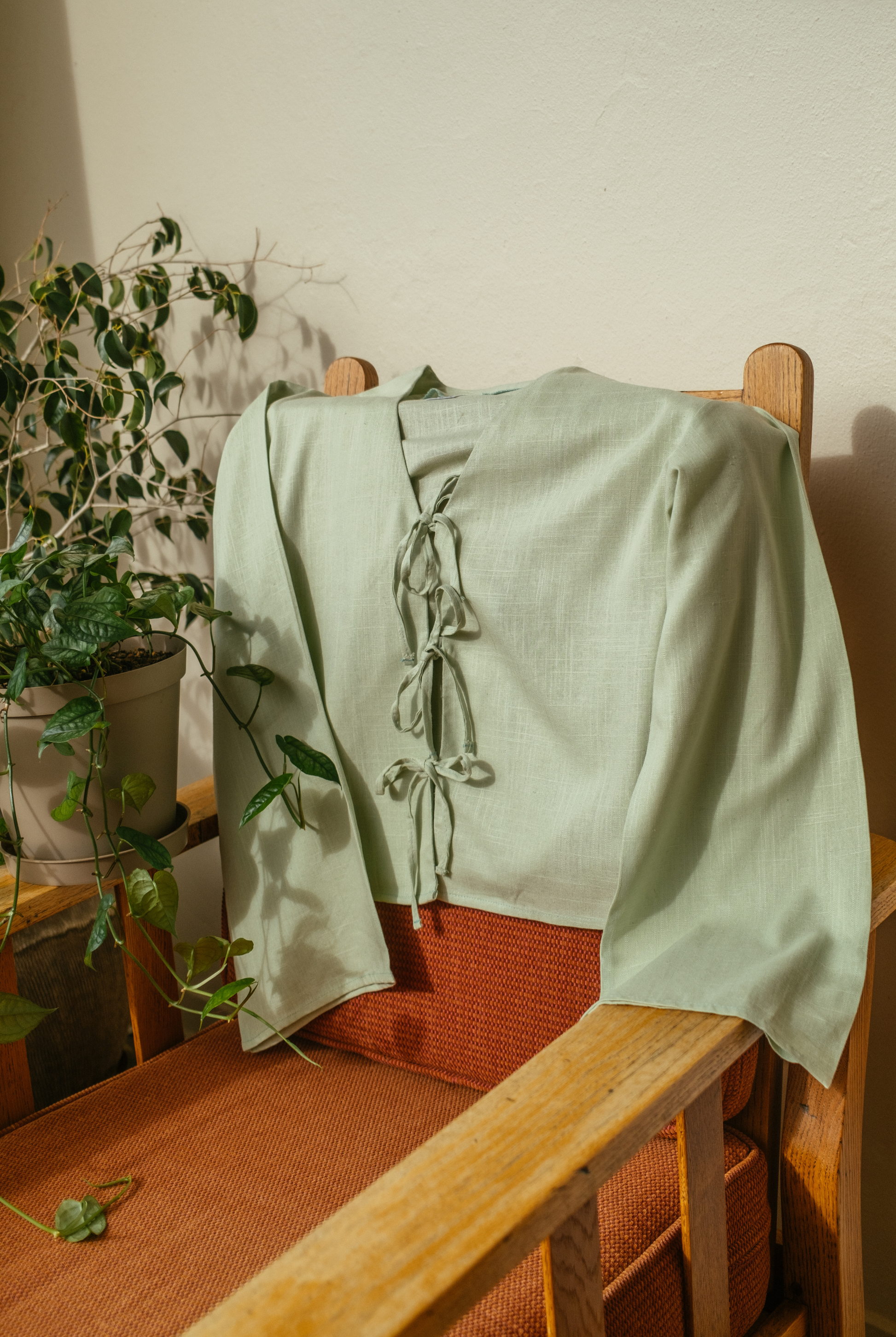 Cut from breathable, lightweight linen, the Cove Top features a deep V-neckline and three delicate front ties that let you adjust your look from open and breezy to neatly cinched. The full-length sleeves add balance and flow, making it perfect for layering or wearing on its own.